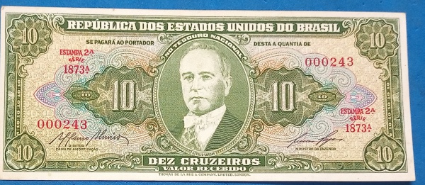 • Cedula/Brasil- Flor de estampa !! Numeração exótica (000)243 !! nr. muito baixo !10 cruzeiros verde, ass. Lucas Lotes !! estimativa 50,00 R$