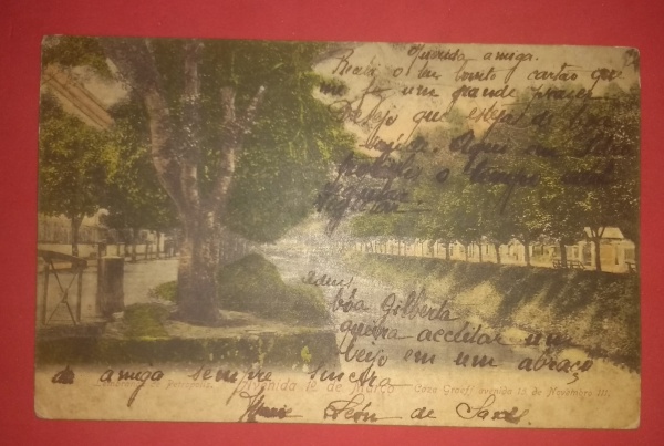 • Cartofilia, Bilhete Postal, com selo de época, Petrópolis Av 1° de Março, 1911 (Colorizado) - Raridade