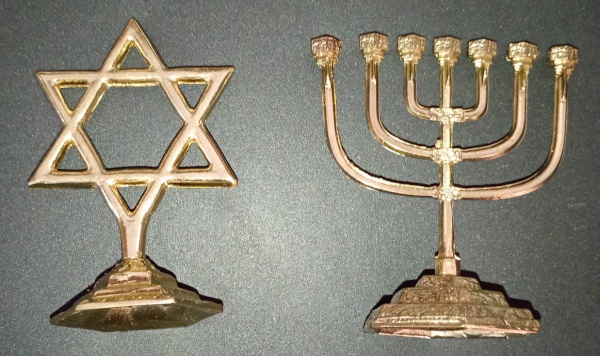 • Colecionismo- 2 peças do jadaismo, pequeno catiçal e pequena estrala de David !! em metal cor de oUro !! altura das peça 9,0Cm !!