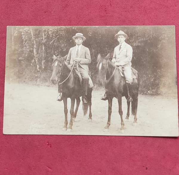• Cartofilia - 2 senhores montados a cavalo !! com roupas de cidade !! epoca de 1930 !! raridade !