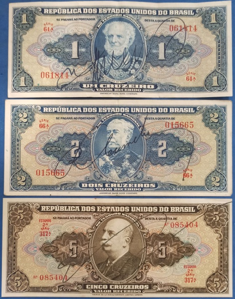 • 3 cedulas /Brasil - Autografadas !! Valor de 1, 2 e 5 cruzeiros !!! Decada de 1950  !!! .. Valor Muito abaixo de mercado !!! otimo estado !! quase Flor de estampa !!