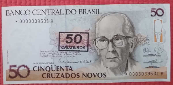• Cedula - Brasil - Cedula de Reposição !! 50 Cruzados novos !! numeração com asteristicos !! Flor de estampa !! com carimbo de 50 cruzeiros !!