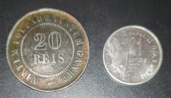 • 2 moedas - brasil - valor de 20 reis do ano de 1908 !! material bronze e 1 centavo FAO ano de 1975 !!