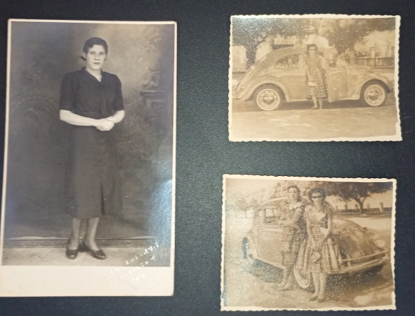 • Fotografia - 3 fotos de moças com fusca novinho no ano de 1964 !! + cartão de presente com forto de moça do ano de 1934 !! preto e branco !!