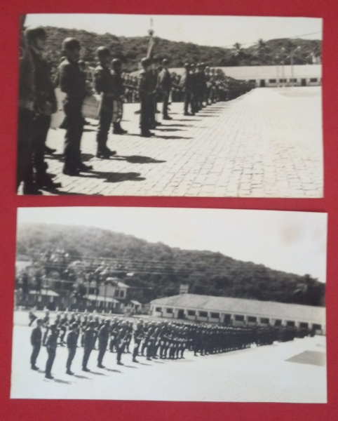 • Fotografia, 2 Fotos em preto e branco, Soldados em forma de quartel, uniforme completo, década de 1960!!! Tamanho de 11cm x 18 cm