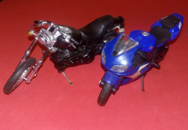 • 2 Miniaturas de motos, Yamaha R1 Azul e Estradeira preta, as duas com descanso perfeito, Maisto