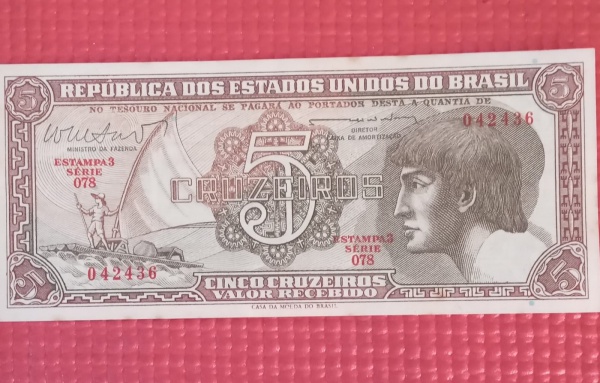 • Cedula - Brasil !! valor de 5 Cruzeiros  tipo indio !! Flor de estamnpa !! serie 078 !! valor estimativa de mercado - 40,00 Reais !! muito abixo de mercado