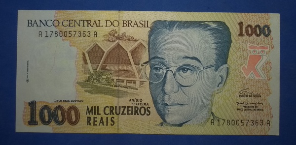 •  cedula /-  Brasil - 1000  cruzeiros Reais , ultima cedula de mil antes do real Novo !!! Flor de estampa !!!! Catalogo marca 25 R$ !! !!!! !!!
