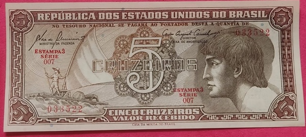 •   Cedula/ Brasil - 5 cruzeiros INDIO !! Serie 007 Flor de estampa !! Numeração exótica 0(33)5(22) dupla repetição !!