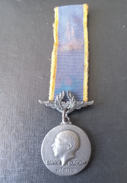 • Medalha da Força Aerea do Brasil !! ministerio da Aeronáutica !! Merito Santos Dumont !! criada em 1956 !! com pequena fita azul e amarela !! m,aterial cinza metalico !!