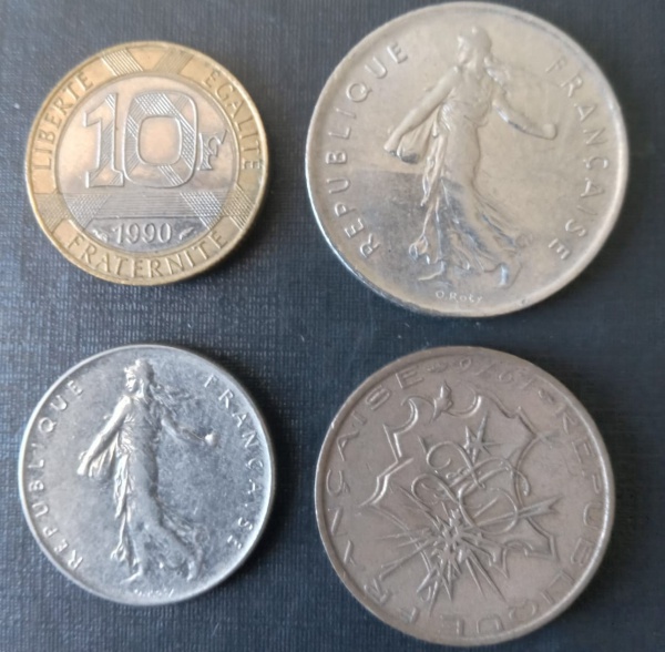 • 4 Moedas da França !! todas diferentes !! valor de 1 Franco + 5 Francos + 10 Francos  !! todas datas diferentes !! aumente sua coleção !! material variado !!