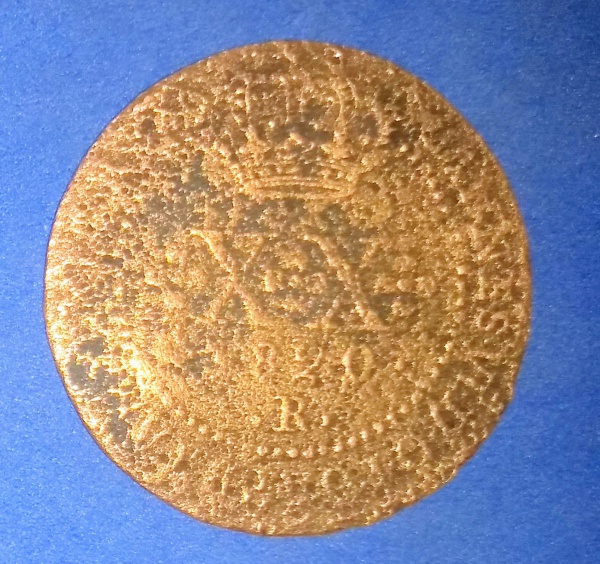 • Moeda/ Brasil - valor de XX Reis Tempo  do Imperio ano 1786 c/ carimbo de escudete  !! Cobre , Soberba !! valor estimado = 290, 00 R$ !! raridade !!