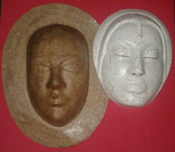 • Arte popular, 2 mascaras feitas em papel marchê, uma em cor branca craqueada com feição feminina e outra em forma de chepéu, com rosto humano, cor marrom.