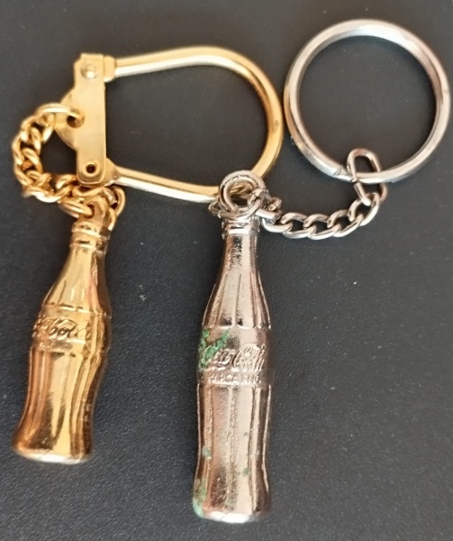 • Colecionismo- 2 chaveiros da Coca - cola !! um cor de ouro !! e outro cor de Prata !! tamanhos iguais !! acervo de colecionador !! material metal pesado !! garrafa de coca !! altura de 35mm !!