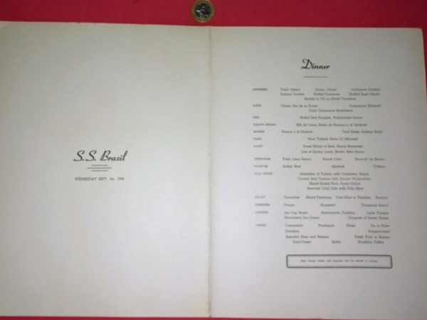 • Colecionismo, cardapio de jantar em papel cartão do Navio  S.S Brasil, Wesdnesday Sept 1948, moore, me cormack, lines, the good Heightbor 7 leet, acervo de colecionador !! raridade !!