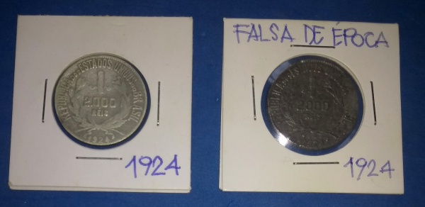 • 2 Moedas / brasil- valor de 2000 Réis ano0 de 1924 , material Prata !! Sendo uma falsa de época !!