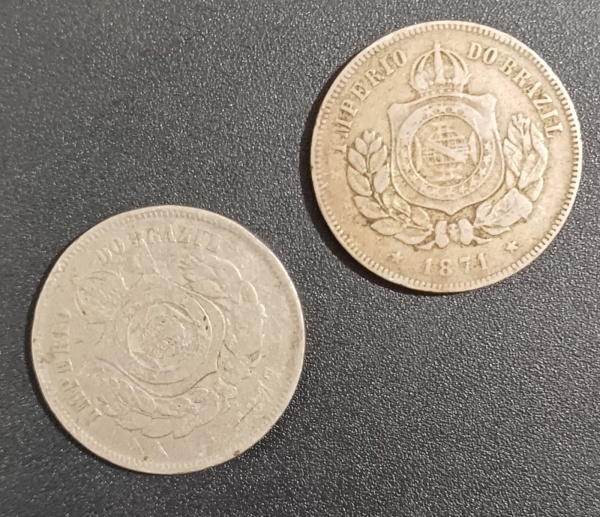 • 2 moedas - Brasil - valor de 200 reis anos de 1877 e 1871 !! tempo do imperio !! material cuproniquel !!