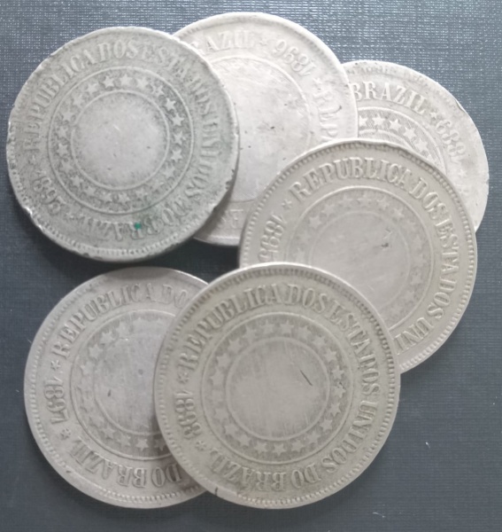 • 6 moedas do Brasil !! valor de 200 Reis !! datas logo após a proclamação da Republica !! material cuproniquel !! anos de 1889 + 1893 + 1895 + 1896 + 1897 + 1898 !! preço de ocasião !!