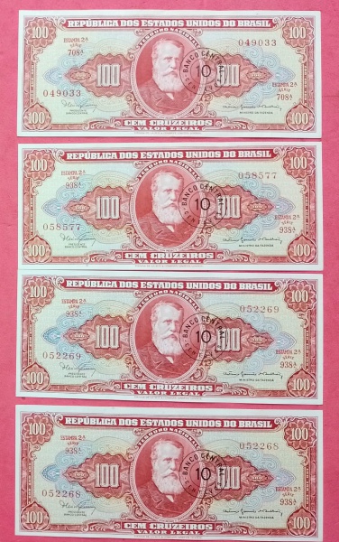 • 4 cedulas ; Brasil - Flor de estampa valor de 100 Cruzeiros cor vermelha  !! Modelo com carimbo   !! !!