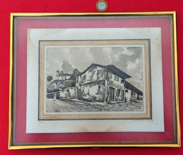 • Quadro de vidro, com moldura de metal dourado, 1 desenho assinatura em reprodução autorizada, a casa de Alejadinho (M.G)