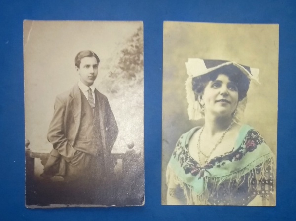 • cartofilia- 2 Post Card   !! Decada de 1930  ! Rapaz vestindo terno de época e moça de chapéu (cor ) !!