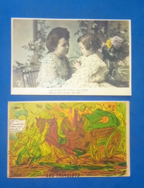 • cartofilia- França !! 2 peças !! Carruagem Charge de Guerra !! E mãe com filha colorizado  !!decada de 1930  !! !!