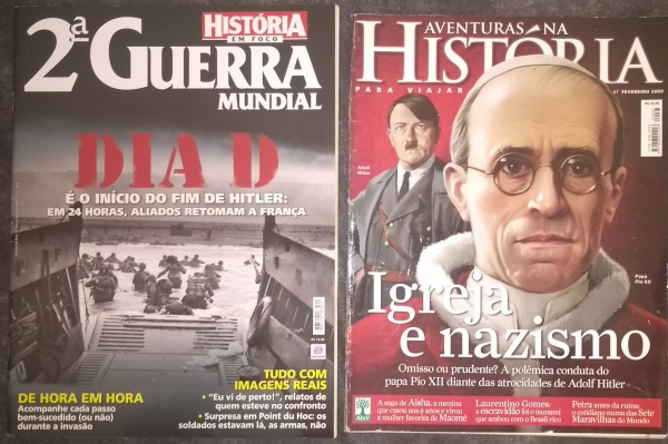 • 2 revistas da 2a Guerra Mundial, 1- O dia `D` tudo sobre este evento, história em foco e 2- A igreja e nazismo a polêmica conduta do Papa Pio Xll, diante das atrocidades de Adolf Hitler