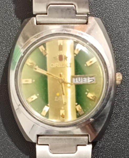 • Relogio Marca ORIENT Automatico !! com calendario dia e semana !! pulseira metalica original !! muito tempo guardado, precisa revisão ou conserto , acervo de colecionador !! cor verde e amarelo !!