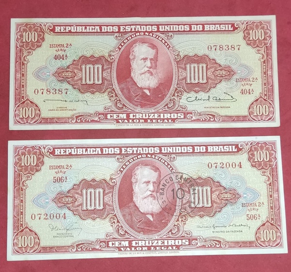 • 2 Cedulas - Brasil - valor de 100 cruzeiros  !! Cor vermelha !! Com e sem carimbo de desvalorização !! Complete sua coleção !