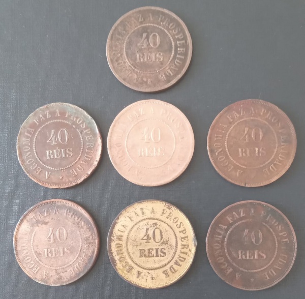 • 7 moedas - Brasil !! valor de 40 Reis datas de 1893 (1x) + 1900 (2x) + 1908 (2x) e 1909 (2x) material em bronze !! Primeira Republica !! valor muito abaixo de mercado !!