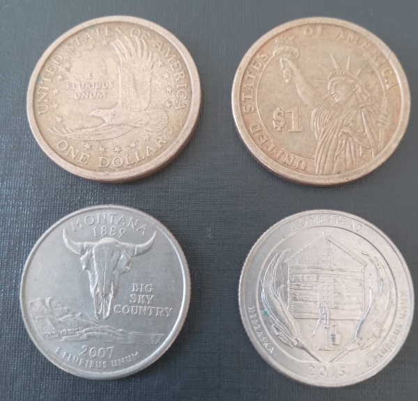 • 4 Moedas dos USA !!! todas diferentes e comemoreativas !! valor de 1 dollar e de Quarter dollar !! valor abaixo de mercado !!