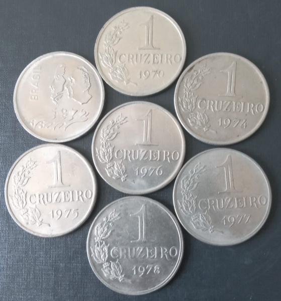 • 7 Moedas do Brasil , valores de 1 cruzeiro com serie completa !! otimo estado de conservação !! alto valor de mercado !! material liga de aço e niquel !!