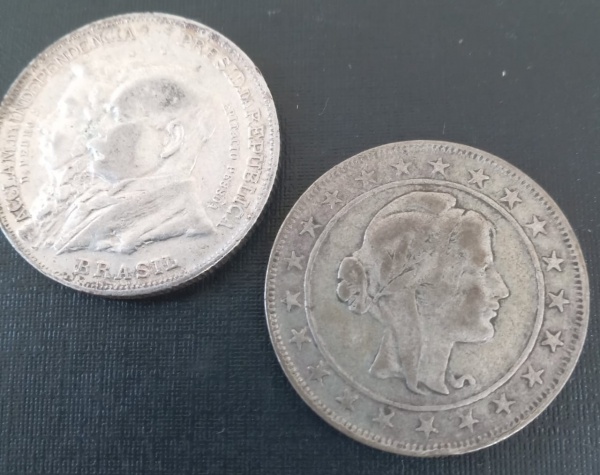 • 2 Moedas - Brasil - valor de 2000 Reis data de 1922 !! comemoreativa , em material de prata !!  + outra de 2000 Reis Mocinha ano de 1924 !! tambem em prata !!