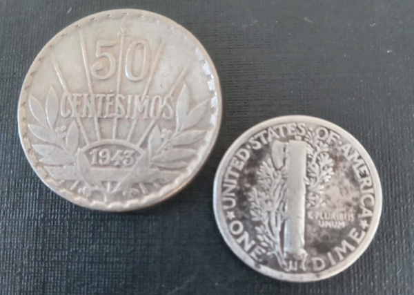 • 2 Moedas - Estrangeiras l - origem USA !! valor de Dime ano de 1931 !! e outra de Uruguuai de valor de 50 centesimos ano de 1943 ! tambem  em material de prata !!