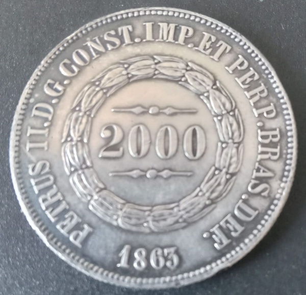 • Moeda - Brasil !! valor de 2000 Reis data de 1863 !! material prata 917 !! variação do segundo tipo !! tambem chamada de patacão !! alto valor de mercado cerca de 400,00 Reais !!