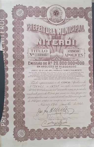 • Colecionismo- Titulo da Divida publica da cidade de Niteroi R.J. apolice de 2000.000,00 do ano de 1942 !! assinatura do prefeito da època !! ccom as etiquetas de resgate com datas de 1955 ate 1967 !! acervo de colecionador !!