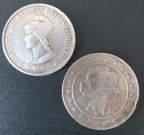 • 2 Moedas do Brasil !! material prata !! valor de 500 Reis data de 1889 , prata 900 !! e 2000 Reis data de 1924 !! tipo mocinha !!