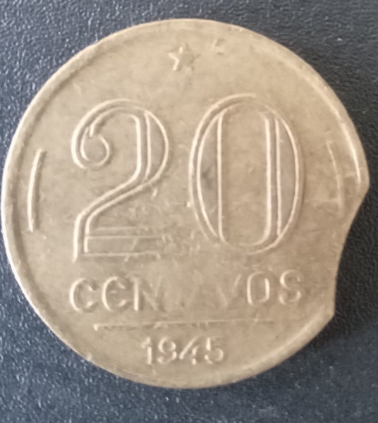 • Moeda- Brasil valor de 20 centavos !! Erro corte com falha !! erro catalogado !! data de 1945 !! material bronze /aluminio !!
