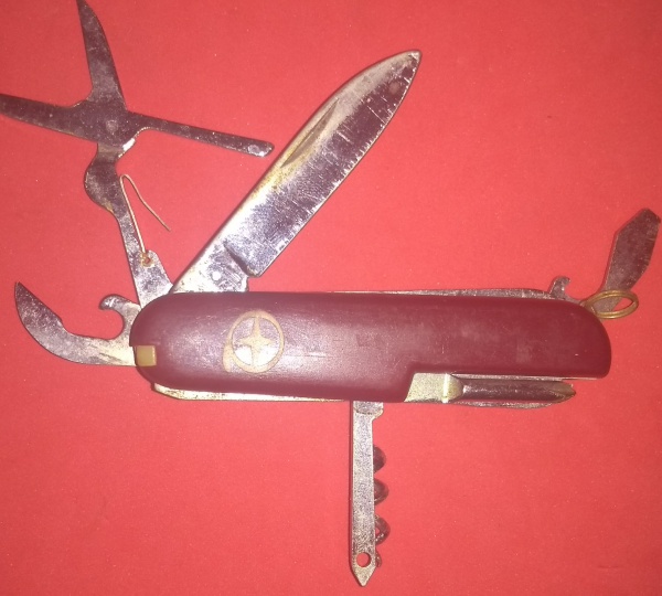 • Canivete suiço, 11 tipos de lâminas de utilidades diferentes, inclusive tesoura e serra