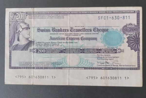 • Antiga Cedula de Viajem TRAVELLERS Cheque !! muito utilizado no passado como dinheiro aceito em qualquer PAIS !! valor de 200 Francos Suiços !! emissão pelo Banco de BERNE !! Suiça !! guardado por colecionador !!