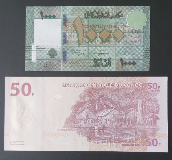 • 2 cedulas Estrangeiras !! CONGO e LIBANO  !! material flor de estampa !! lindas peças !! acervo de colecionador !! cores vibrantes !! desenhos lindos !!