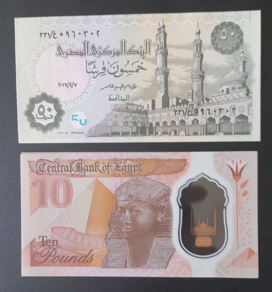 • 2 cedulas Estrangeiras !!  Ambas do Egito  !! material flor de estampa !! lindas peças !! acervo de colecionador !! uma delas em policarbonato !! ( material Plastico )