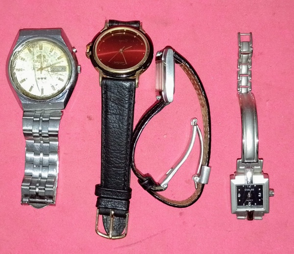 • 4 Relogios !! lotinho !! modelos masculinos e femininos !! não foram testados ! !! pulseiras de couro e metalicas !! marcas diferentes !! todos tambem para retiradas de peças !!
