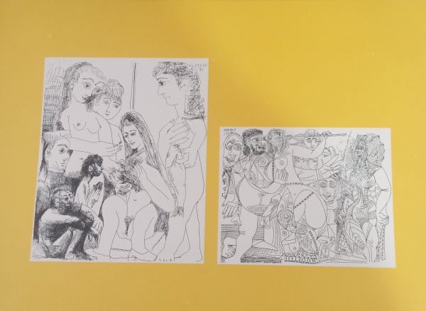 • Arte Erótica !! Autor Pablo Picasso !! Reprografia original !! Peça em fundo amarelo com 2 desenhos em preto e branco em bico de pena nanquim preto !! , dataa de março e setembro de 1968  !! - tamanho 36cmx25,5cm !! perfeito para enquadrar !! !! acervo de colecionador !! alto valor de mercado !!