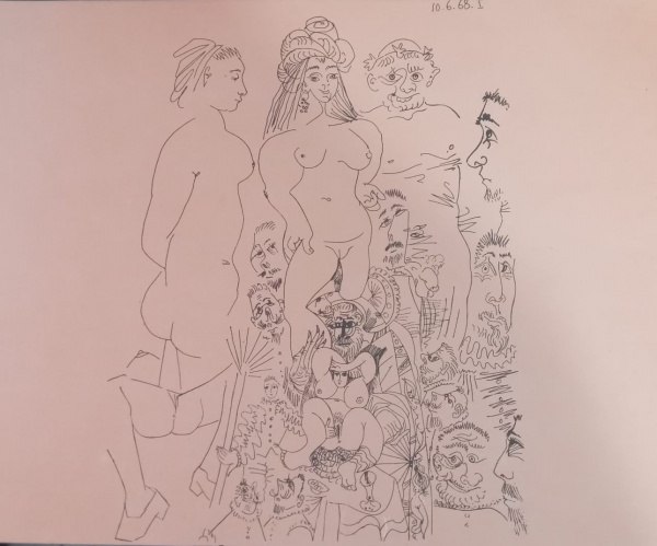 • Arte Erótica !! Autor Pablo Picasso !! Reprografia original !! Peça em fundo Laranja  com desenho com 15 cabeças  em bico de pena nanquim preto !! , data de Junho  de 1968  !! - tamanho 36cmx25,5cm !! perfeito para enquadrar !! !! acervo de colecionador !! alto valor de mercado !!