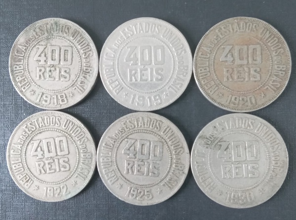 • 6 Moedas do Brasil !! valor de 400 reis !! todas datas diferentes !! 1918 - 1919 - 1920 - 1922 - 1925 e 1930 !! material cuproniquel !! complete sua coleção ou começe uma nova por valor de oportunidade !!