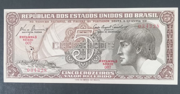 • Cedula - Brasil !! valor de 5 cruzeiros tipo Indio serie 007 !! boa conservação , alto valor de mercado cerca de 20 reais !!