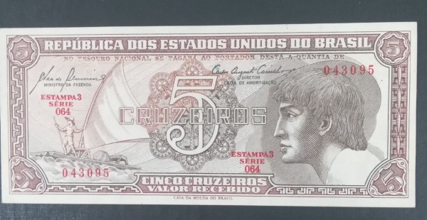 • Cedula - Brasil !! valor de 5 cruzeiros tipo Indio serie 064 !! estado de flor de estampa !! , alto valor de mercado !! cerca de 40 Reais !!