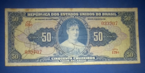 • cedulas / Brasil - 50 cruzeiros serie azul !!!  com autografo !!! Peça já escassas    .... ,  valor de mercado cerca de 120 Reais  !!!